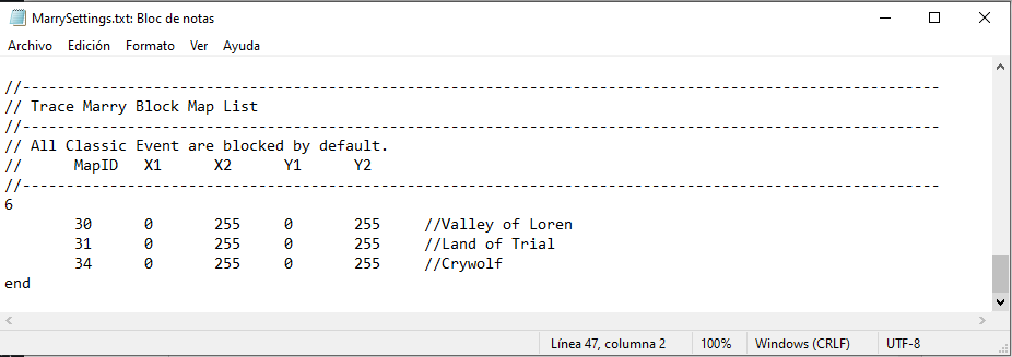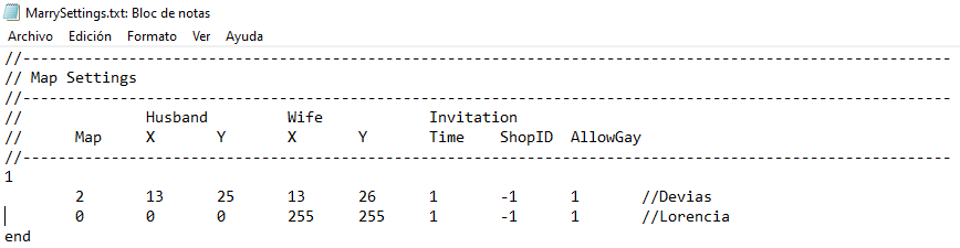Aquí estableces en que mapas y posiciones debes estar el Hombre y la Mujer en X/Y. SI el mapa no esta permitido, la propuesta no será envidada.