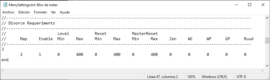 Estableces si esa permitido divorciarse, y en que mapa. Los rangos de Level, Reset y Master Reset junto con el costo de Zen, WC, GP, Ruud.