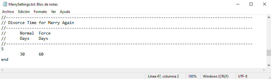 Establece en DIAS el tiempo que tendrán como penalidad para volver a casarse. Esto se guarda en la base de datos.
