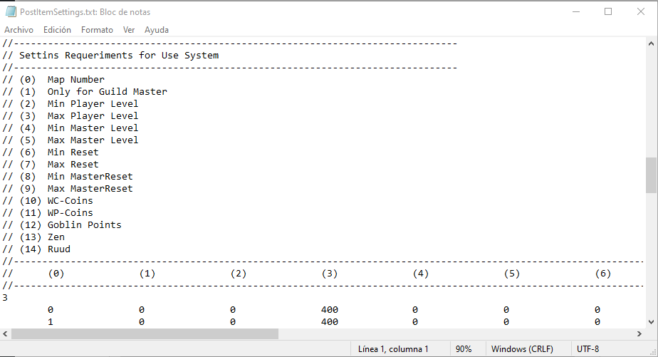 Las columnas hablan por si mismas. Las primeras 10 son requisitos para personajes por mapa y las siguientes 5 son requerimientos para poder usar el sistema.